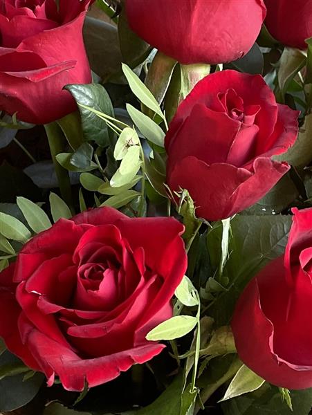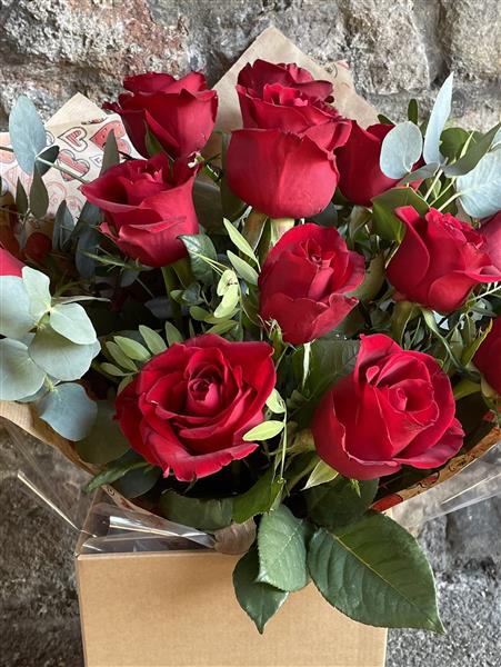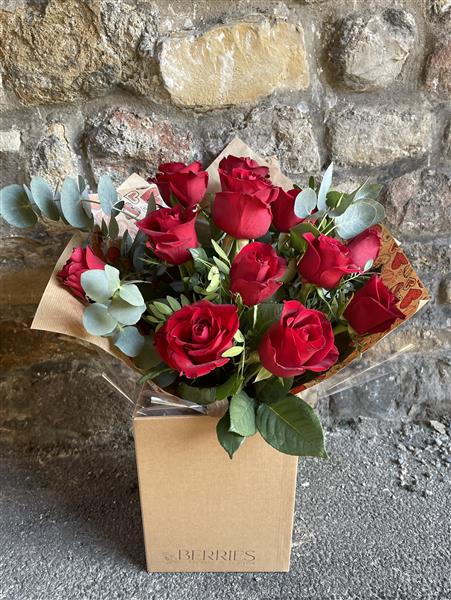 The classic! A dozen beautiful large- headed red roses expertly combined with complimentary seasonal foliage.