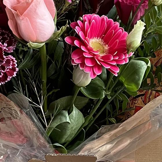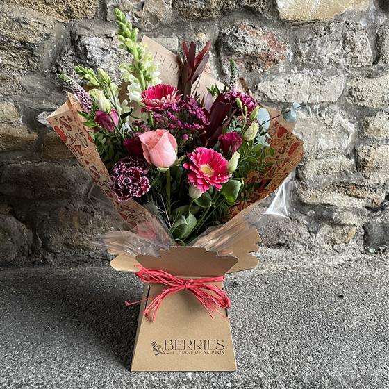 This bouquet is designed, wrapped and delivered direct from our shop locally. It will arrive aqua-packed and presented in a box. We use recyclable packaging where possible.