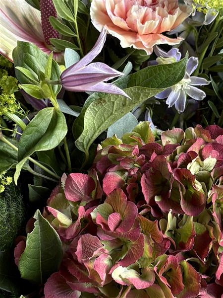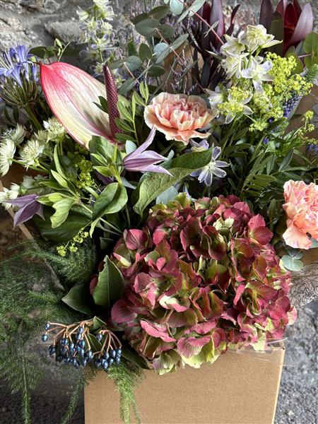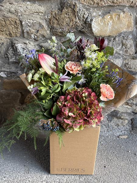 A wintery, textured bouquet combining dramatic burgundy tones, cool purples, deep blues and pinks. Layered and natural textures give this arrangement a lush, organic feel inspired by northern winter nights.